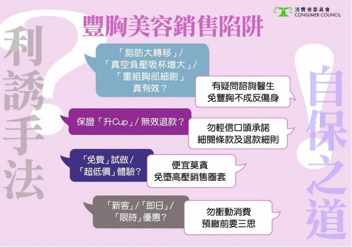 不少女士追求完美身形,都會到美容公司購買豐胸療程及產品等,于是各式各樣豐胸美容服務應運而生。消費者委員會過去3年,共接獲20宗有關豐胸療程的投訴。有投訴人於同一美容公司購買合共過百萬元豐胸療程及產品,惟接受一年療程後,沒有明顯豐胸效果,要求消委會協助索回至少70萬元,惟美容公司以療程完成為由拒絕。至於美容公司推銷手法亦受質疑,有個案在半裸下,遭多名職員「圍攻」疲勞轟炸式推銷。
