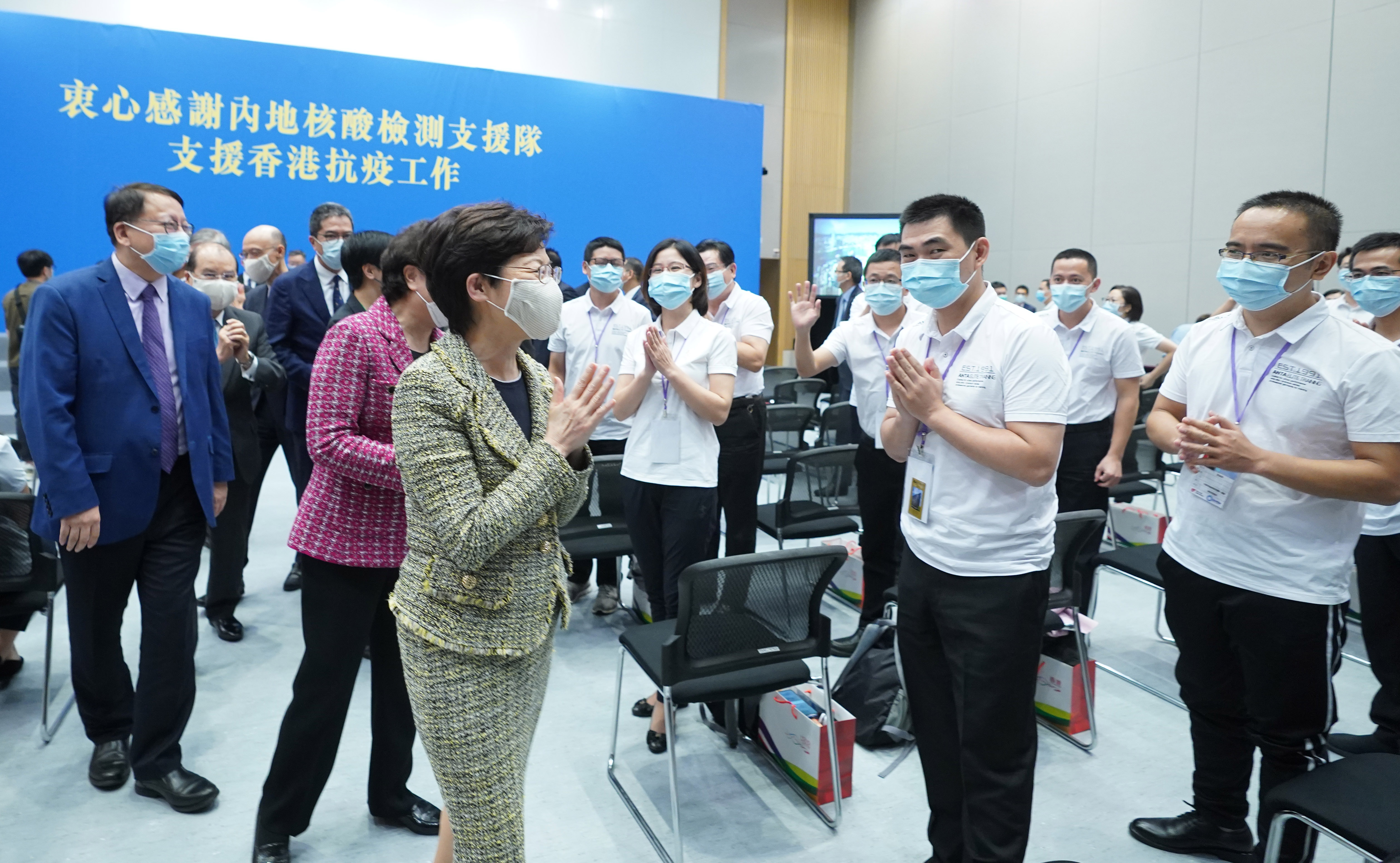 林郑月娥在特区政府举行的欢送仪式上向内地核酸检测支持队队员致谢。新华社