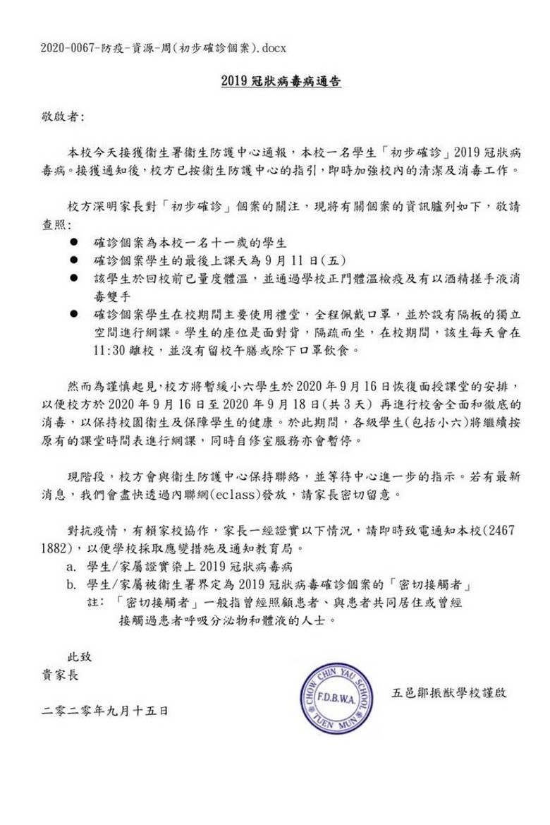 該校通告表示,表示15日接獲衞生防護中心通報,一名 11 歲學生初步確診。感染學生的最後上課天為 9 月 11 日,而該學生在校期間主要使用禮堂,全程佩戴口罩,並於設有隔板的獨立空間上網課。學校表示,校方會暫緩小六學生於16 日面授課堂的安排,學校會一連三天消毒校園。
