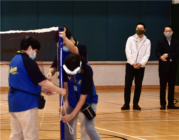 徐英偉及劉明光視察職員在球場裝置羽毛球運動的設施。