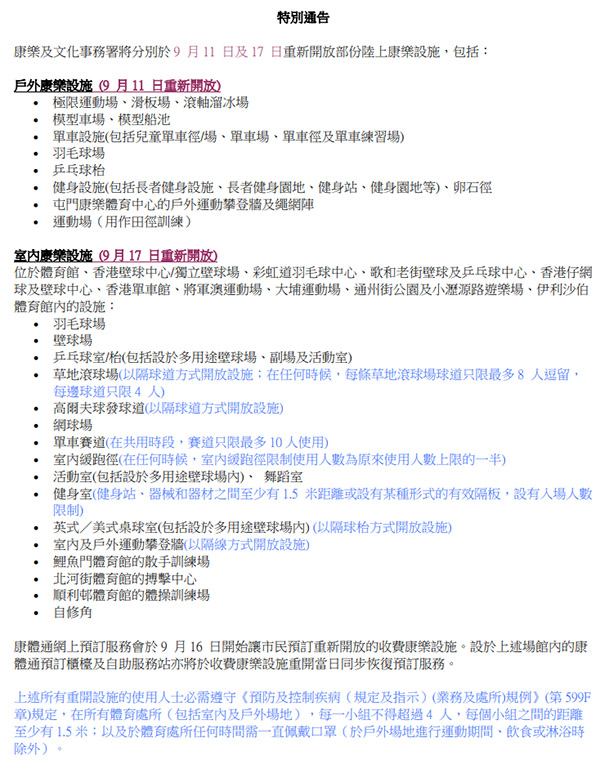 康文署會分階段重開體育場地,明日(17日)重開壁球場、網球場、健身室等室內的康樂設施。市民可於今日(16日)開始,使用康體通在網上預訂重開的收費設施,有關重開康樂設施的安排詳情可參閱康文署網頁。
