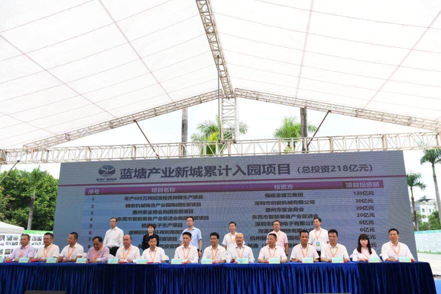 活動現場舉行了惠州市紫金商會抱團投資項目、東莞智能製造協會抱團投資項目、精密機械鑄造產業園抱團投資項目、皓勤電子生產項目等框架協議,杭氧投資項目、新奧天然氣投資項目、廢鋼回收循環再利用投資項目等協議簽訂儀式。這些項目均落戶藍塘產業新城,加上前期引進的總投資130億年產600萬噸短流程優特鋼生產項目,藍塘產業新城入園項目已達218億元。