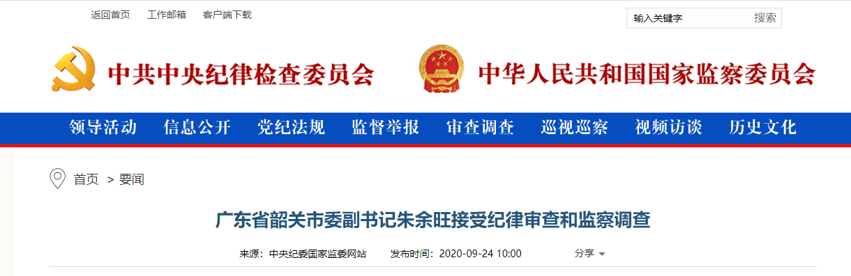 广东省韶關市委副書記朱余旺涉嫌嚴重違紀違法,目前正接受廣東省紀委監委紀律審查和監察調查。