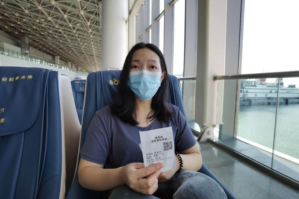 來自廣州的劉小姐順利買到徐聞港首航船票,在全海景候船大廳等候登船