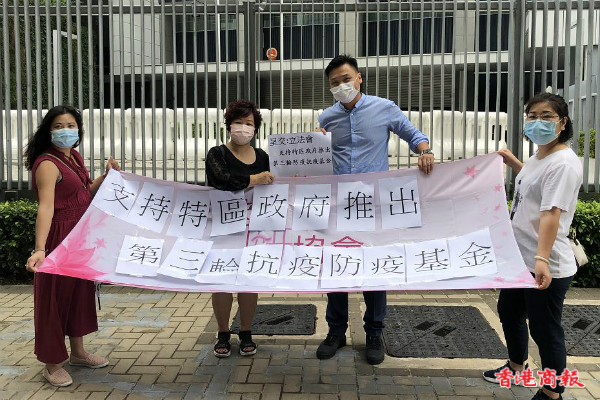 多批市民4人一組今日先後到立法會外請願,他們拉起橫額,叫喊口號,支持政府推出第三輪防疫抗疫基金,並希望立法會能盡快通過。他們又將請願信交給議員代表。