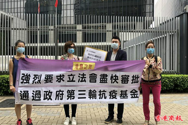 市民團體「港島之友」表示,期望一眾立法會議員能抓緊審批通過第三輪基金,以扶助因疫情影響受苦的市民,穩定香港疫情,開通關口,使香港社會回復正軌,市民生活正常。他們又批評反對派議員,不理港人死活、無心正事,在會上搗亂搞事,攬炒拖延時間,對此表示強烈抗議。
