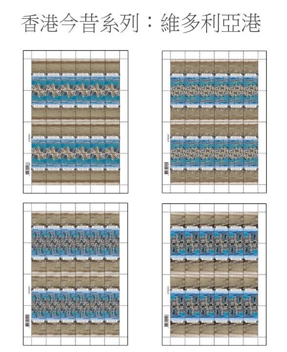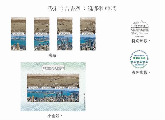 「香港今昔系列‧維多利亞港」為主題的郵票一套共有4枚,上下兩半分別展示1962年及2020年從太平山山頂俯瞰香港島及九龍半島的景致,並以連票設計呈現維港逾半世紀以來的地貌變遷。