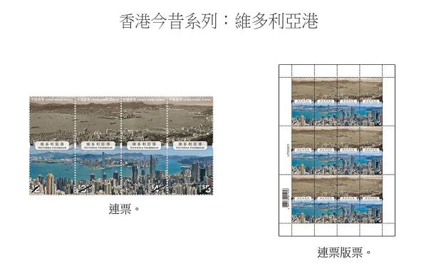 圖為「香港今昔系列:維多利亞港」連票和連票版票。