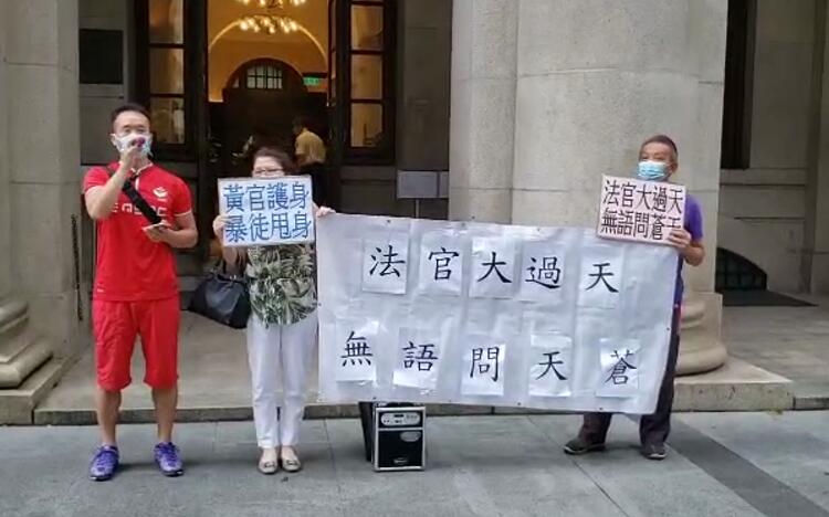 市民代表在大楼前抗议,举3例证明判官何俊堯审案態度偏頗: