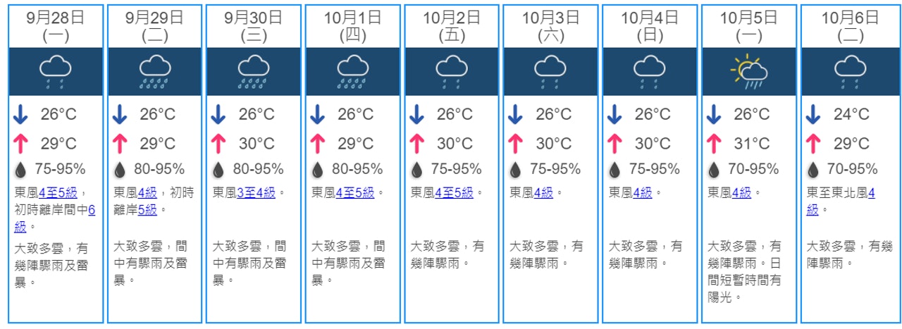本周末至下周初持續多雲、有幾陣驟雨,天文台預測下周一日間短暫時間有陽光,但翌日即收起陽光,市區最低氣溫降至24度。