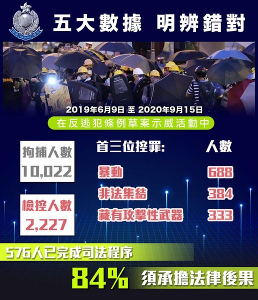 警方今晚(29日)公布,由去年6月9日至今年9月15日,共有10022人涉嫌修例風波中的罪行被捕,當中2227人被檢控。