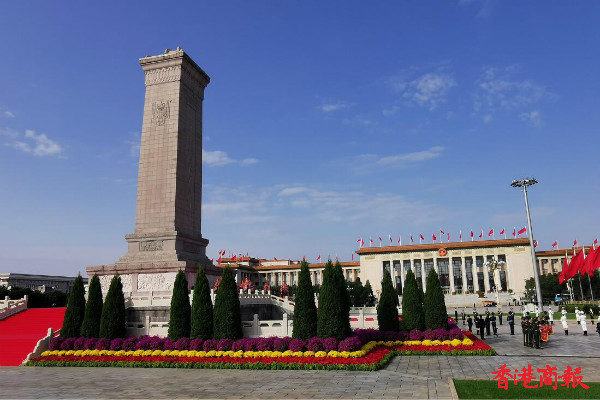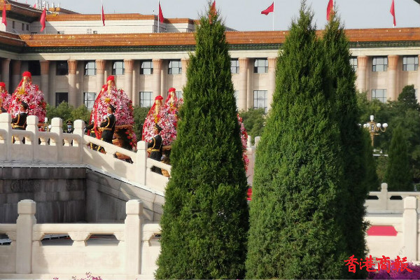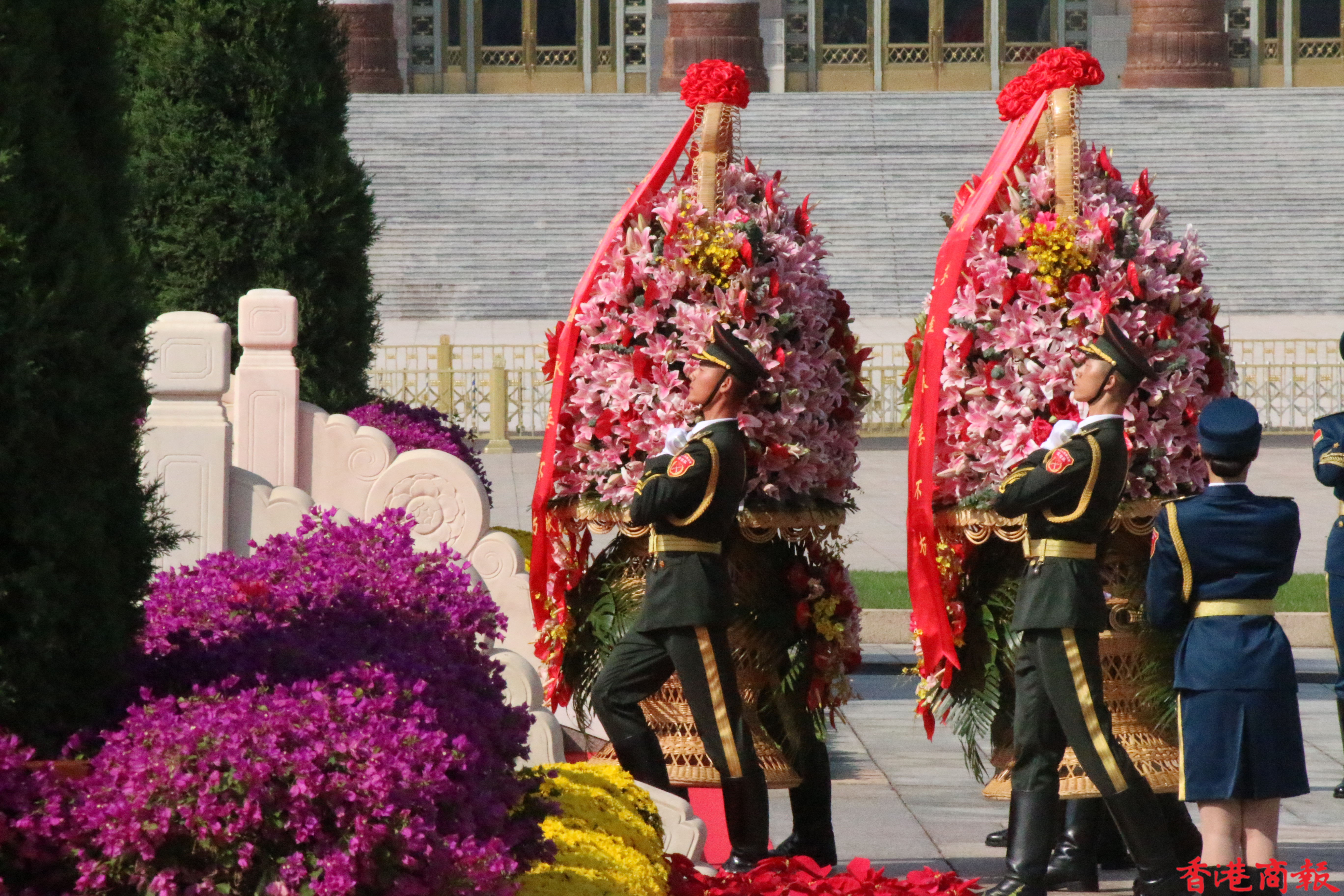 方陣前,以中共中央,全國人大常委會,國務院,全國政協,中央軍委,各民主黨派、全國工商聯和無黨派愛國人士,各人民團體和各界群眾,老戰士、老同志和烈士親屬,中國少年先鋒隊名義敬獻的9個大型花籃一字排開。花籃的紅色緞帶上寫着「人民英雄永垂不朽」。