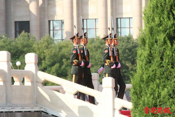 軍樂團奏響深情的《獻花曲》,18名禮兵穩穩抬起花籃,緩緩走向人民英雄紀念碑,擺放在紀念碑基座上。