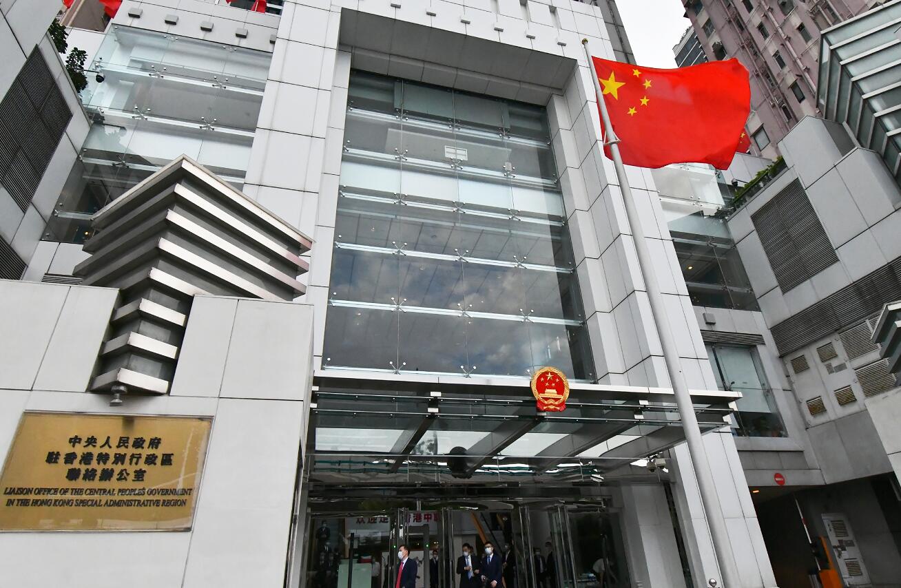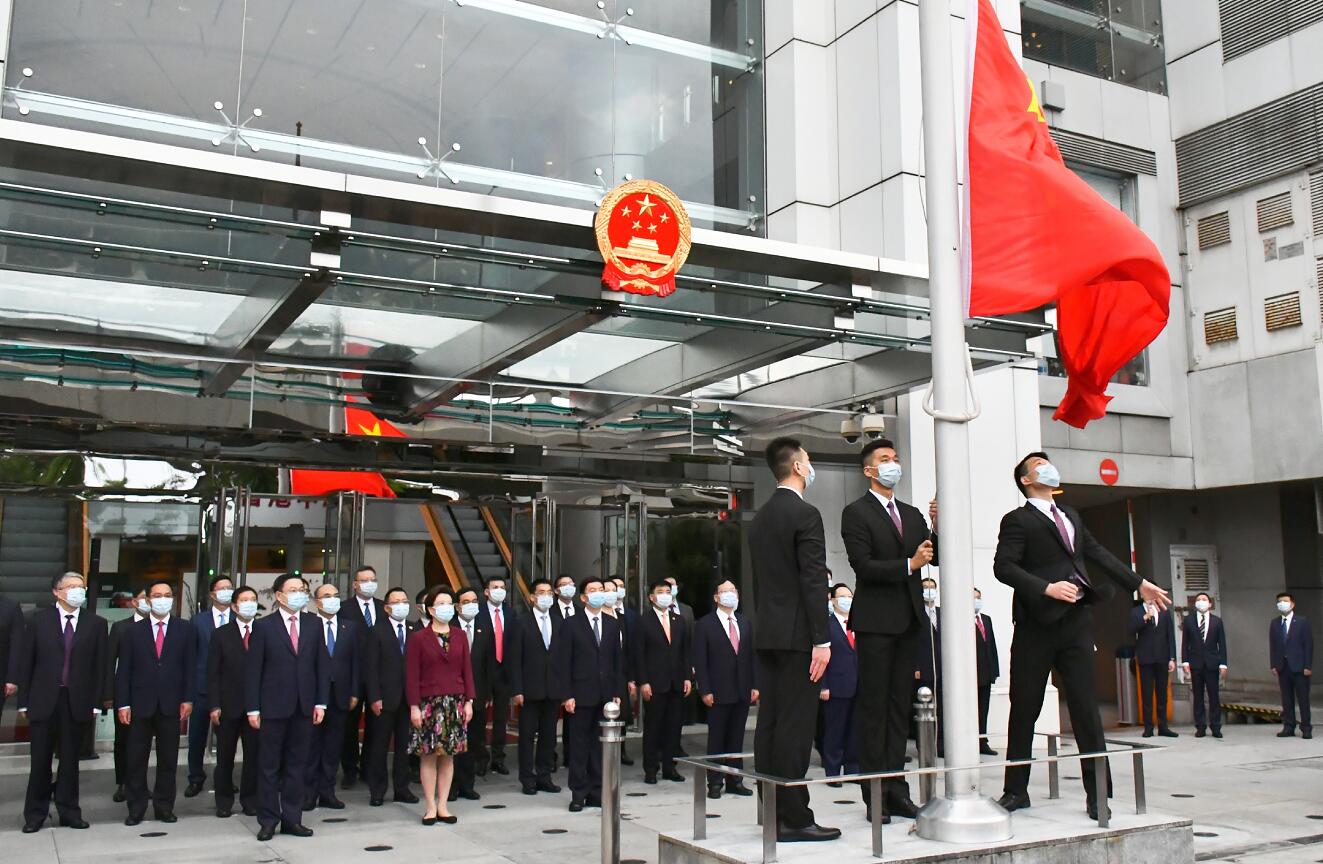 升旗儀式於早上7時開始,國旗徐徐升起,一眾中聯辦領導昂然挺立,並歌唱國歌,整個儀式莊嚴而隆重。儀式進行約5分鐘便圓滿結束。(記者 林駿強 罗璇 摄影 冯瀚文)