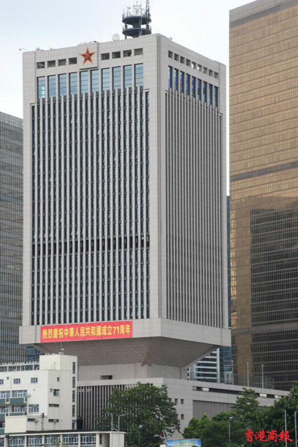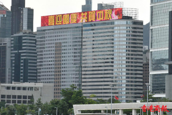 今日一早,中区商廈亦悬挂慶祝國慶的横幅,本港处处节日气氛浓厚。(记者 蔡启文 唐信恒 )