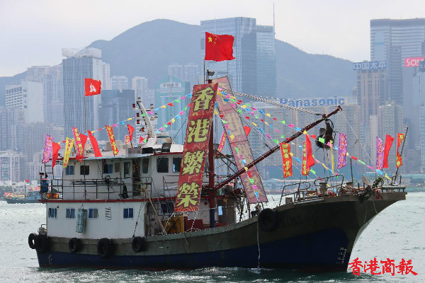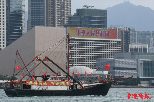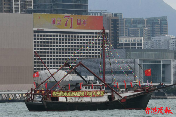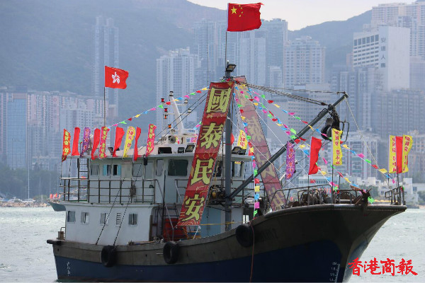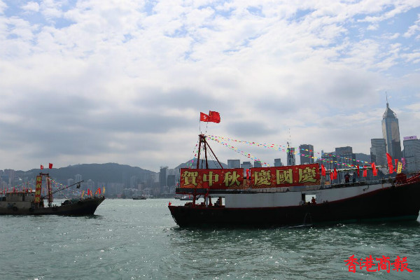 「慶國慶.賀中秋10.1漁船維港巡遊」約早上9時開始,其中8艘漁船寫上各種慶祝字句,分別係「慶國慶 賀中秋」、「慶祝國慶」、「共賀中秋」、「祖國萬歲」、「國盛家興」、「香港繁榮」、「舉國同歡」以及「國泰民安」,船隊巡遊途中分別於中環摩天輪及尖沙咀文化中心水域對出慢駛,方便市民拍照留念。