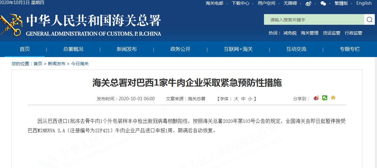 據海關總署官網10月1日消息,因從巴西進口1批凍去骨牛肉1個外包裝樣本中檢出新冠病毒核酸陽性,按照海關總署2020年第103號公告的規定,全國海關自即日起暫停接受巴西MINERVA S.A(註冊編號為SIF421)牛肉企業產品進口申報1周,期滿後自動恢復。