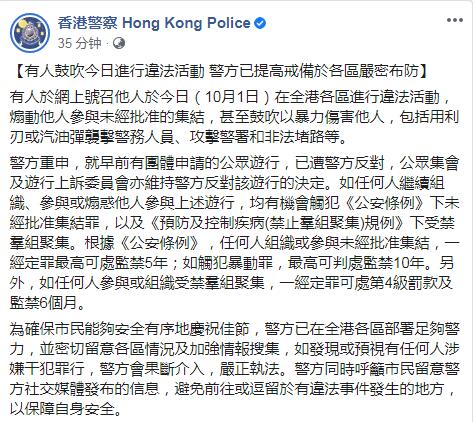警方10月1日上午在FB專頁發布消息稱,有人於網上號召他人於10月1日在全港各區進行違法活動,煽動他人參與未經批准的集結,甚至鼓吹以暴力傷害他人,包括用利刃或汽油彈襲擊警務人員、攻擊警署和非法堵路等。