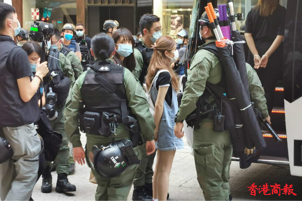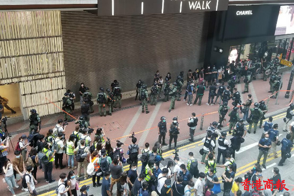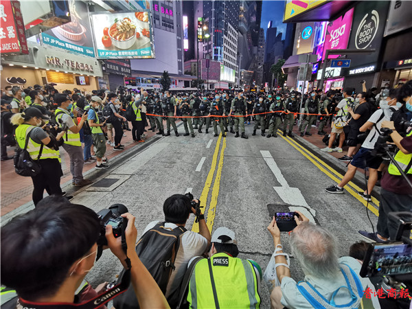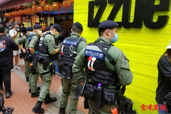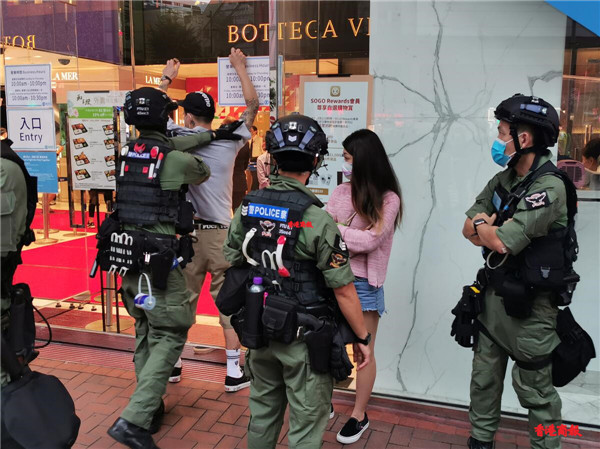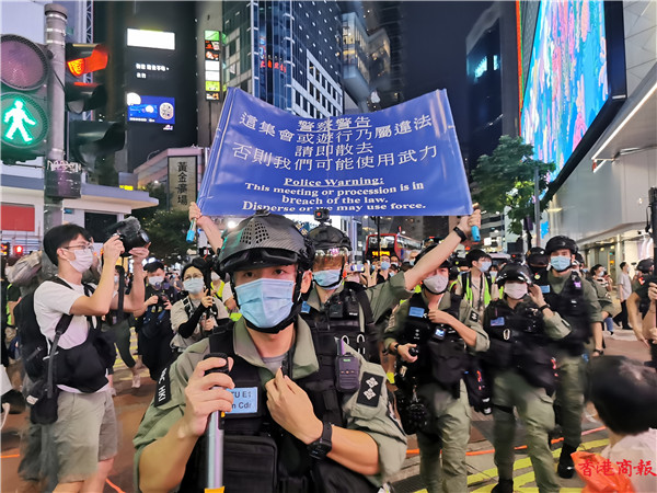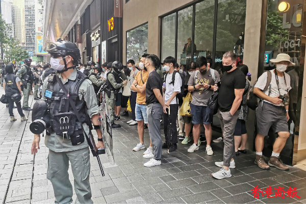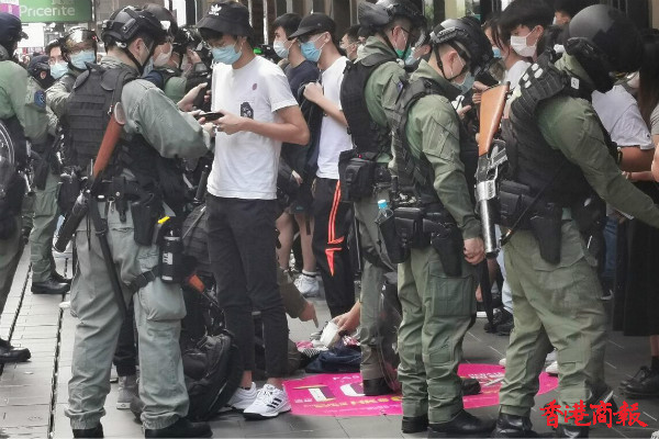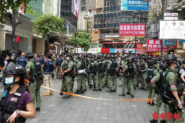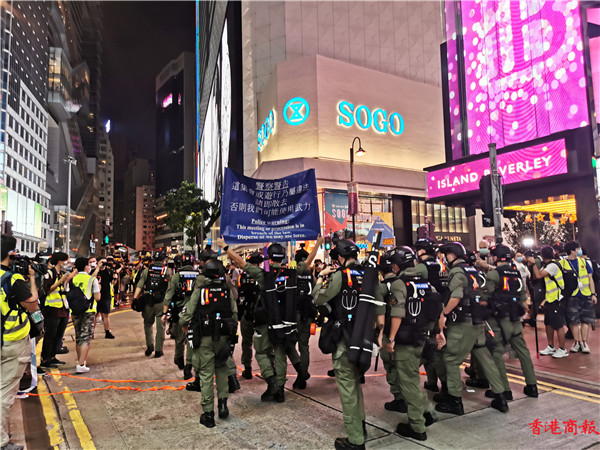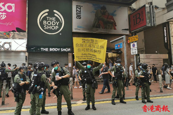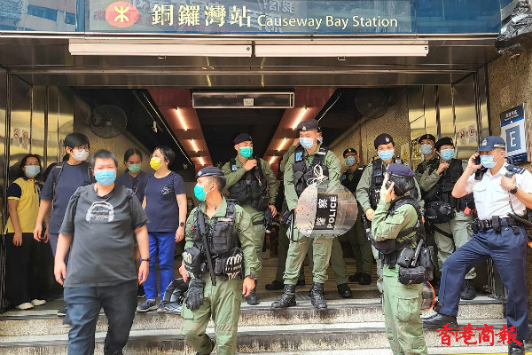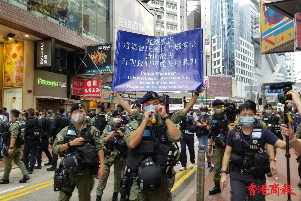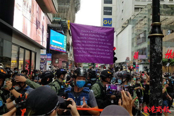 下午3时左右,铜锣湾,警方举紫旗警告,驱散人群。紫旗即指,警告示威者勿展示有分裂國家或顛覆國家政權等意圖的旗幟、橫額,以及口號等,如示威者沒有遵循,警方將以違反《香港國安法》进行拘捕。