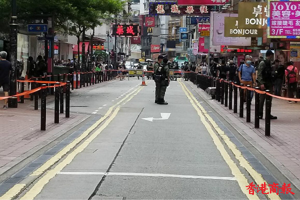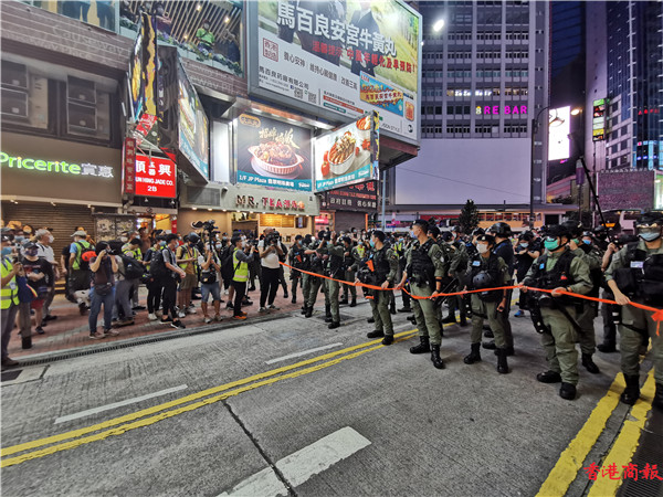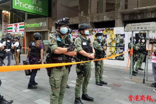 在銅鑼灣記利佐治街和百德新街交界,警方于商場外一段的街道,現場可見有商戶已經落閘,警員拉起橙帶封鎖線戒备,要求聚集在街上的記者和市民離開。
