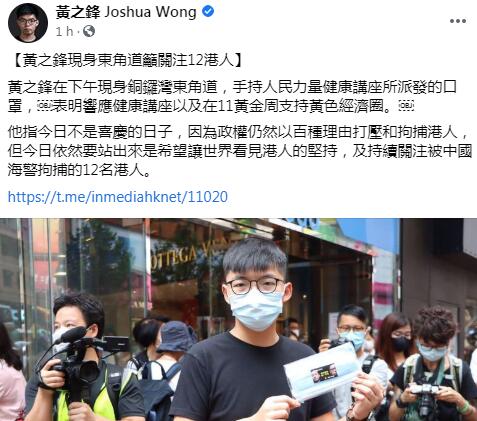 中午1時10分,黃之鋒出现在銅鑼灣東角道,并拿取反对派陳志全在現場派發的口罩。随后续于社交平台煽动网民「站出来」及支持「黄色经济圈」。