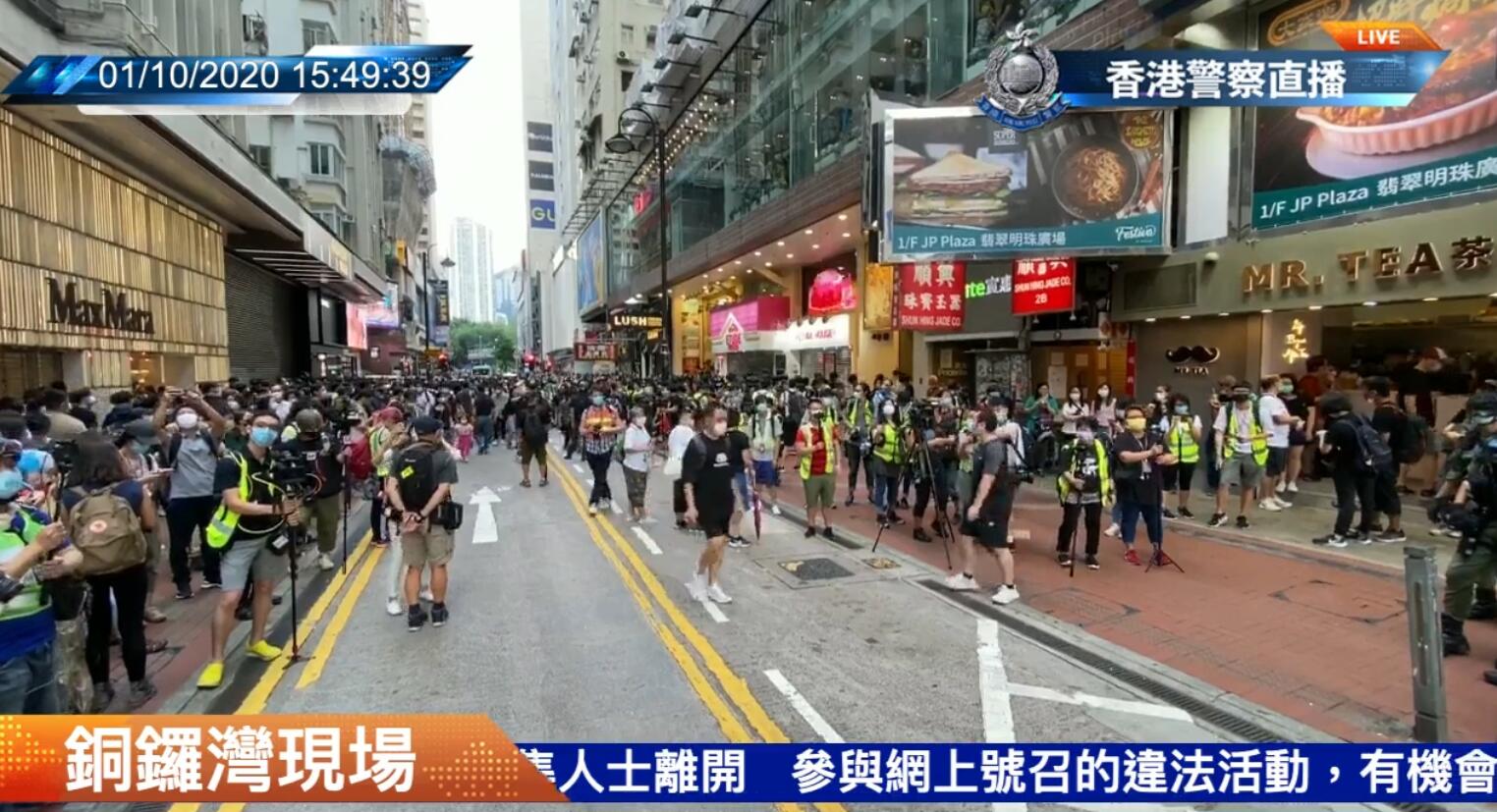 下午3时許,有防暴警察在銅鑼灣一帶多次舉起黄旗及藍旗,警告在場人士正在參與非法集結,要求他們迅速離開,并截查過往的可疑人士。