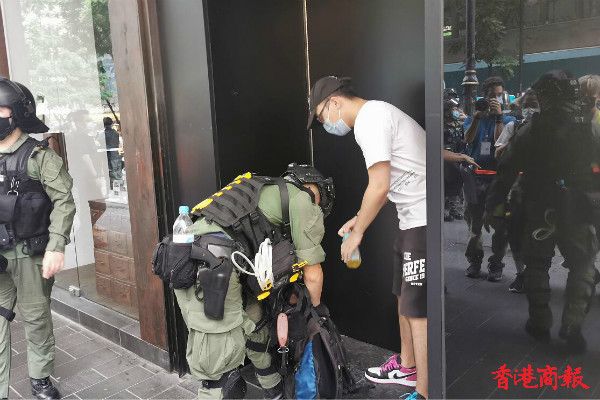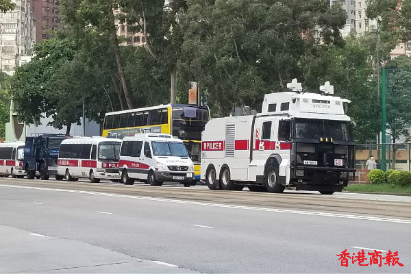 警方上午出動了水炮車和銳武裝甲車,在中聯辦附近戒備,并在紅磡隧道等地設置路障查驗過往車輛。