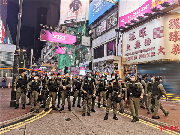 警方嚴厲譴責「示威者」和個別公職人員罔顧公共安全和破壞社會安寧的行為,如任何人企圖挑戰本港法治,警方將會嚴正執法,絕不手軟。警方會繼續在各區巡邏,保障市民生命財產安全,讓市民可以和平有序地慶祝佳節。(记者 区天海 木子 莊海源)