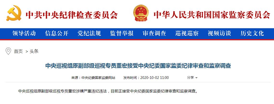 中央紀委國家監委網站消息显示,中央巡視組原副部級巡視專員董宏涉嫌嚴重違紀違法,目前正接受中央紀委國家監委紀律審查和監察調查。