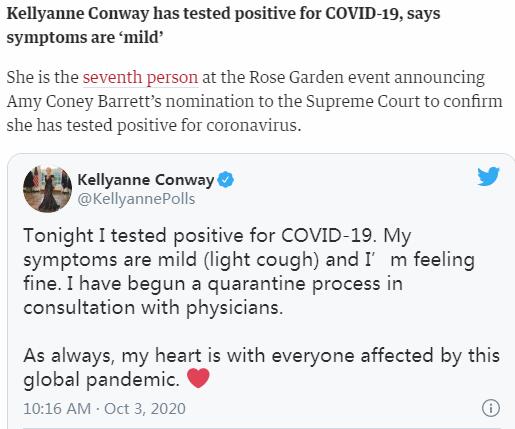 特朗普高级顾问凯莉安妮·康威发推称自己新冠病毒检测结果呈阳性,症状轻微,已开始隔离。