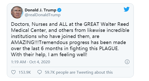 特朗普形容此次疫情為「瘟疫」,稱過去6個月在抗擊這一場「瘟疫」方面,取得重大進展,在醫護人員協助之下,他現時感覺很好。