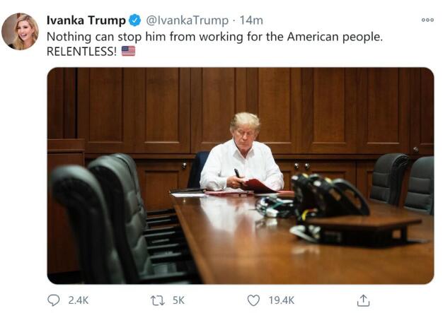 随后,特朗普的女儿伊万卡在推特上贴出了父亲的「工作照」,并写道:「没有什么事可以阻止他为美国人民工作,坚持不懈!」