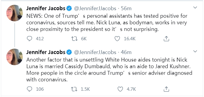 彭博社駐白宮記者珍妮佛·雅各布斯(Jennifer Jacobs)4日在推特發文稱,特朗普私人助理尼克·盧納(Nick Luna)新冠檢測呈陽性。