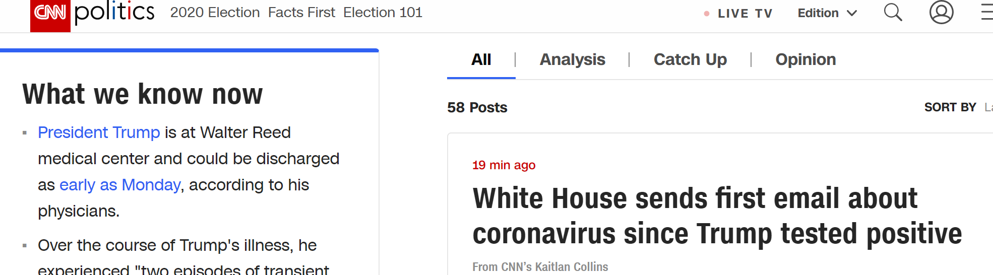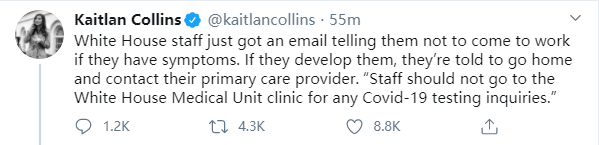 CNN駐白宮記者凱特蘭·柯林斯發推特稱,白宮工作人員剛剛收到了一封電子郵件,通知他們如果出現新冠肺炎相關症狀就不要去上班,若患病則被通知回家並聯繫自己的家庭醫生。「員工不得到白宮醫療部進行任何新冠病毒檢測的諮詢。」柯林斯寫道。