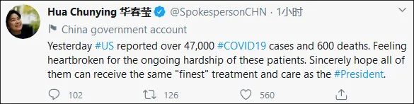 中國外交部發言人華春瑩10月4日就在推特上表達了對美國新冠患者的關切:「昨天,美國報告了47000例新冠肺炎確診病例和600例死亡病例。這些病人面對的苦難令人心碎,衷心希望所有美國患者,都能得到像總統一樣『一流』的治療待遇。」