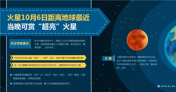 中國天文學會會員、天津市天文學會理事史志成說,今年10月14日火星「沖日」。由於火星和地球的近日點不在同一條赤經線上,因此「沖日」當天,往往不是它與地球最近的時刻。通常情況是,它們距離最近的時間可能比「沖日」日期提前幾天或推遲幾天。這一次火星與地球距離最近就比「沖日」日期提前了8天。