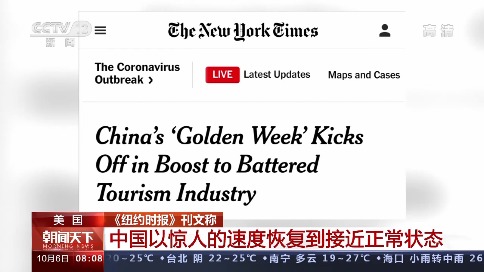 近日,美國《紐約時報》發表了一篇題為《中國「十一」黃金周提振遭受重創的旅遊業》的報道。報道指出,中國「十一」黃金周的跡象表明,中國已經以驚人的速度恢復到接近正常狀態。