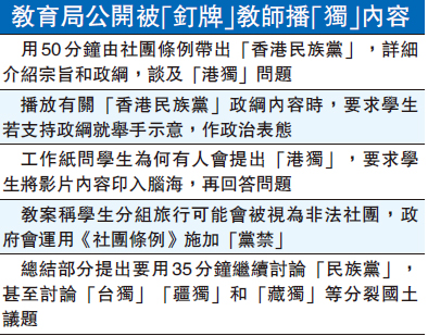 局方指,該教師在課程中向小五學生用50分鐘時間,有計劃地介紹當時已被列為非法組織的「香港民族黨」,詳細講解該黨宗旨和政綱,又談及「港獨」問題,討論議題包括「香港應否獨立」、「從播放片段中提出香港要獨立的原因」等。