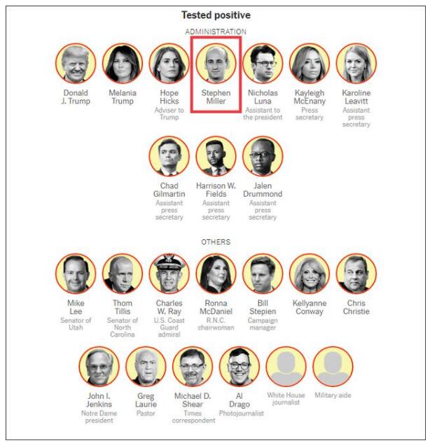 截止目前,特朗普近期接触过的已确诊人员(红框内为史蒂芬·米勒)。图源:纽约时报