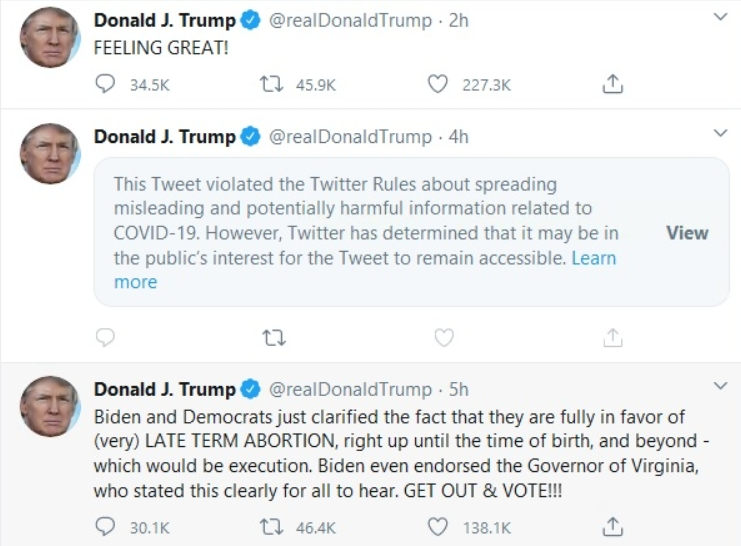 據美國消費者新聞與商業頻道(CNBC)6日消息,當天,臉書直接刪除了特朗普發佈在該平台的這條帖文,而推特雖然並未直接刪除,但給有關推文貼上了標籤,稱「違反了推特有關傳播與新冠相關的誤導性與潛在有害信息的規定」。