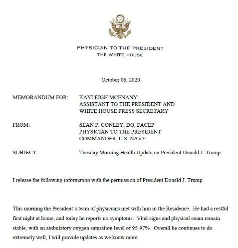 白宮醫生:特朗普已經無症狀 情況「非常好」