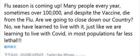 特朗普在Twitter上表示,流感季節即將到來,即使已經有疫苗,亦可能有超過10萬人死於流感,屆時還需考慮是否亦需要封鎖國家。因此他認為人們要學習與新冠病毒共存,與流感一樣。