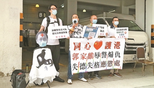 同心護港、香港善美聯盟及愛國者聯盟7日分別帶同橫額及標語,到公民黨總部請願。同心護港表示,10月1日是國慶及中秋節,當日有人煽動非法集會,警方當日嚴正執法並拘捕了80多人,但郭家麒卻失德失格,於社交媒體公開侮辱警察為「一堆綠色物體」,涉嫌煽動仇恨,直指有關做法十分無恥。同心護港曾就郭家麒的所作所為諮詢法律意見,指郭涉嫌違反香港法例第200章《刑事罪行條例》第10條,促請警方調查,如有違法,速速拘捕。