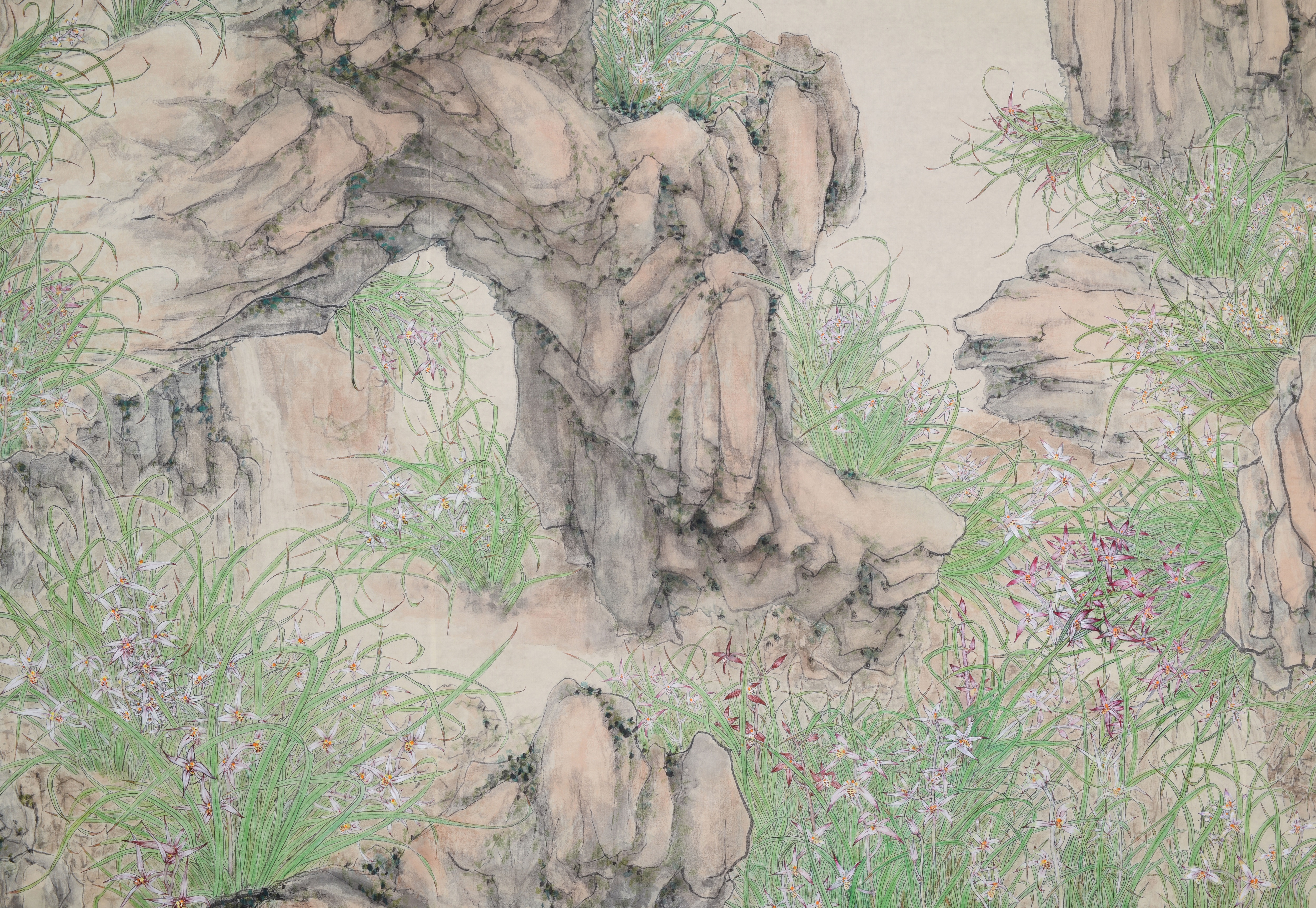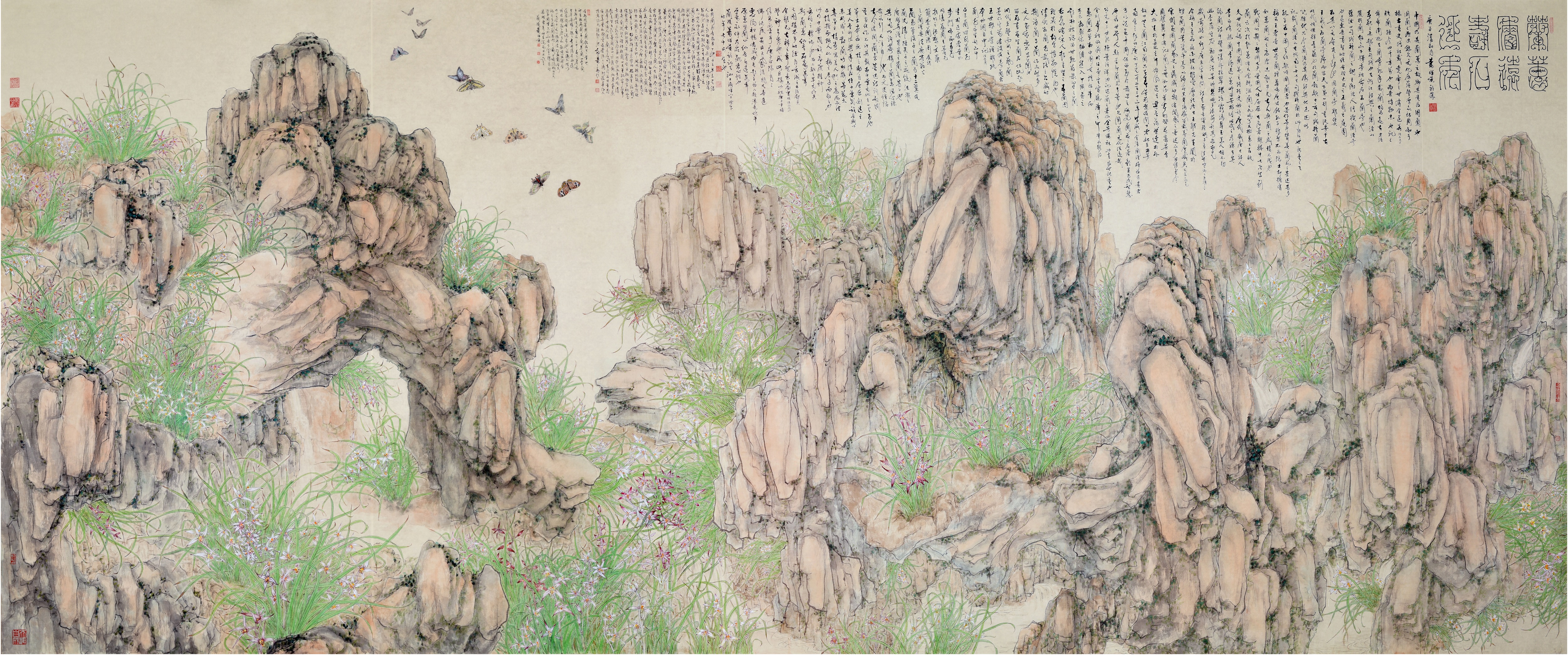 蕭暉榮作品《蘭蕙香遠 壽石延年》,200x497cm,2020年。