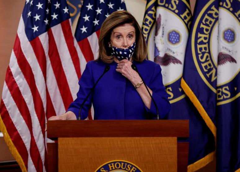 美国众议院议长佩洛西(Nancy Pelosi)在演讲中调整面罩。路透社资料照片