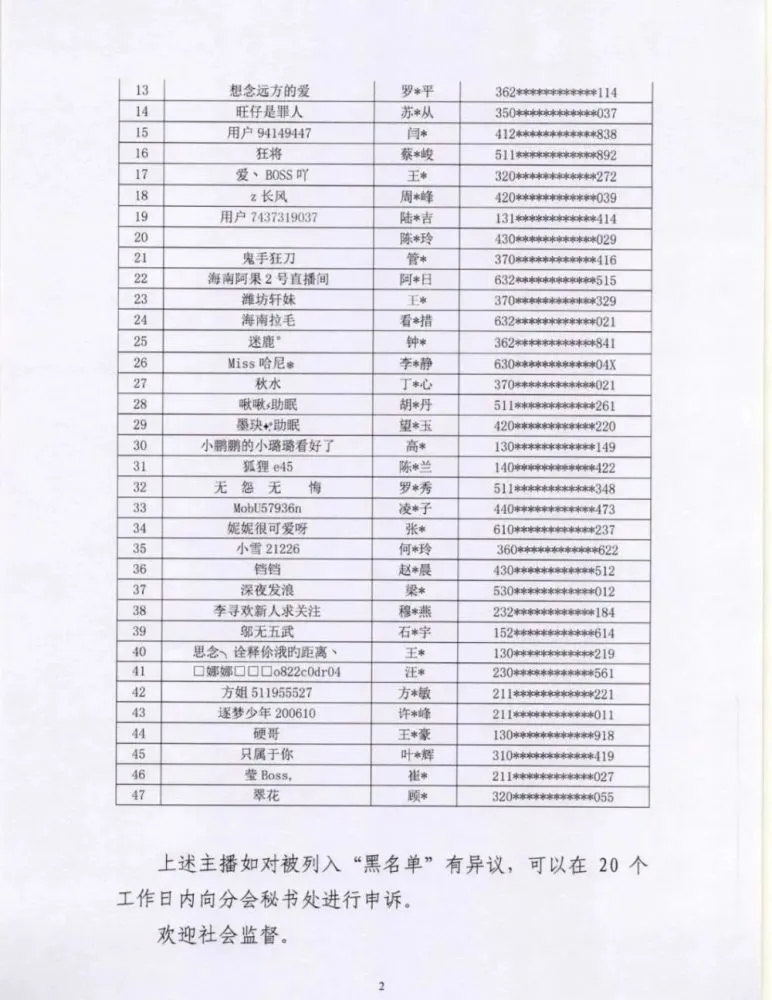 人民網10月12日消息,中國演出行業協會網絡表演(直播)分會向社會公佈第七批主播黑名單,47名主播涉嫌從事違法違規活動,列入主播黑名單。