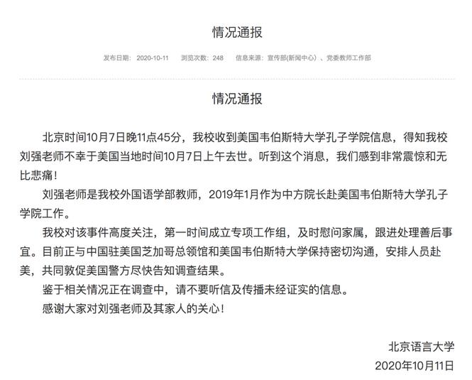 北京语言大学网站10月11日发布情况通报称,得知学校刘强老师不幸於美国当地时间10月7日上午去世,感到非常震惊和无比悲痛!刘强老师是外国语学部教师,2019年1月作为中方院长赴美国韦伯斯特大学孔子学院工作。