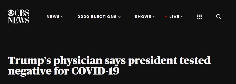 據CBS消息,白宮醫生肖恩·康利宣布,特朗普的新冠檢測結果連續幾天為陰性,且目前不具有傳染性。