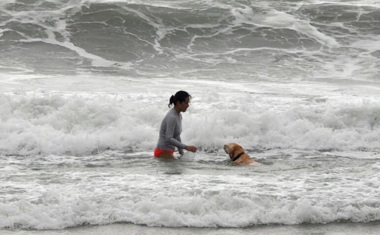 現場可見海面有大浪,有冲浪人士一度被淹沒在海中。另外,亦有市民無懼大浪,攜同狗隻在岸邊散步。