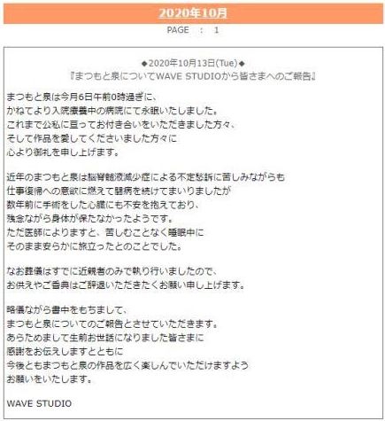 日本經典漫畫《橙路》的作者松本泉,上星期二醫院逝世,終年61歲。他的死訊13日在官方網站公布,指喪禮已經由親友低調舉行。